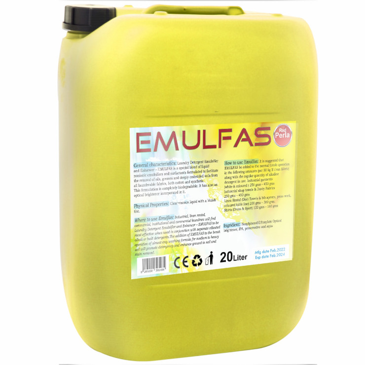 Emulfas is a powerful laundry detergent emulsifier and enhancer by PDI Trading PLC. Ideal for industrial and commercial laundries, it effectively removes oils, greases, and stains while enhancing fabric brightness.