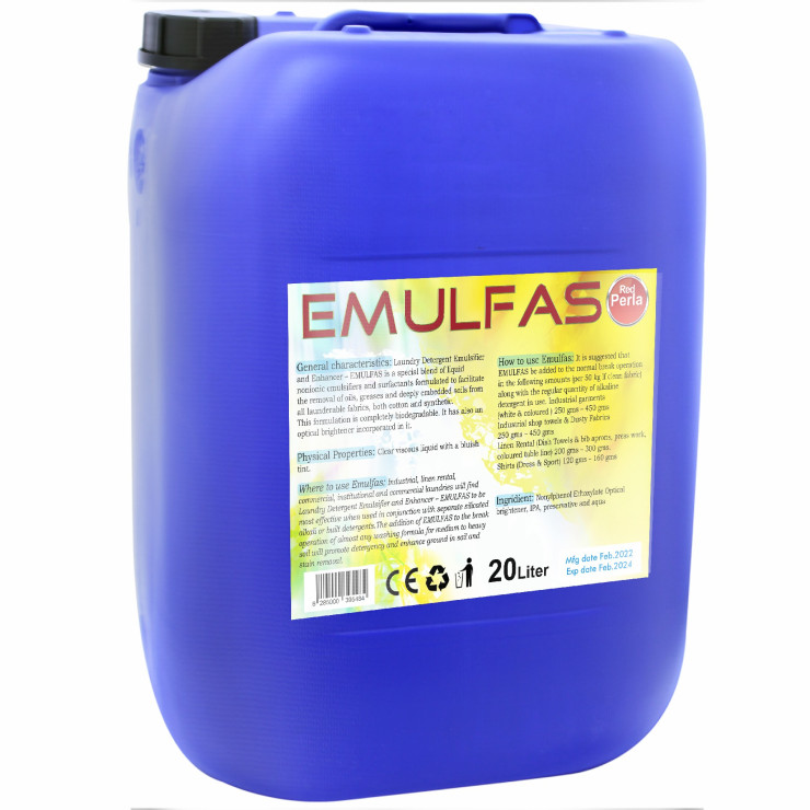 Emulfas is a powerful laundry detergent emulsifier and enhancer by PDI Trading PLC. Ideal for industrial and commercial laundries, it effectively removes oils, greases, and stains while enhancing fabric brightness.